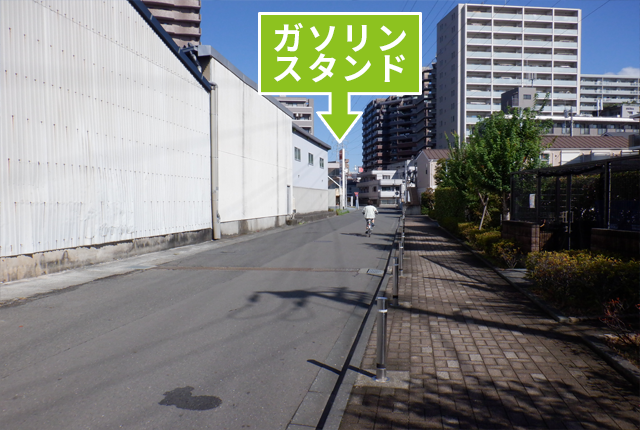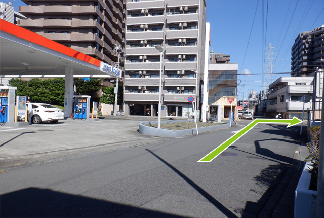 ガソリンスタンドのある交差点を右折してください。