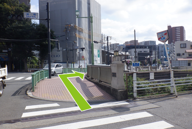 境橋を渡り、交差点を右折してください